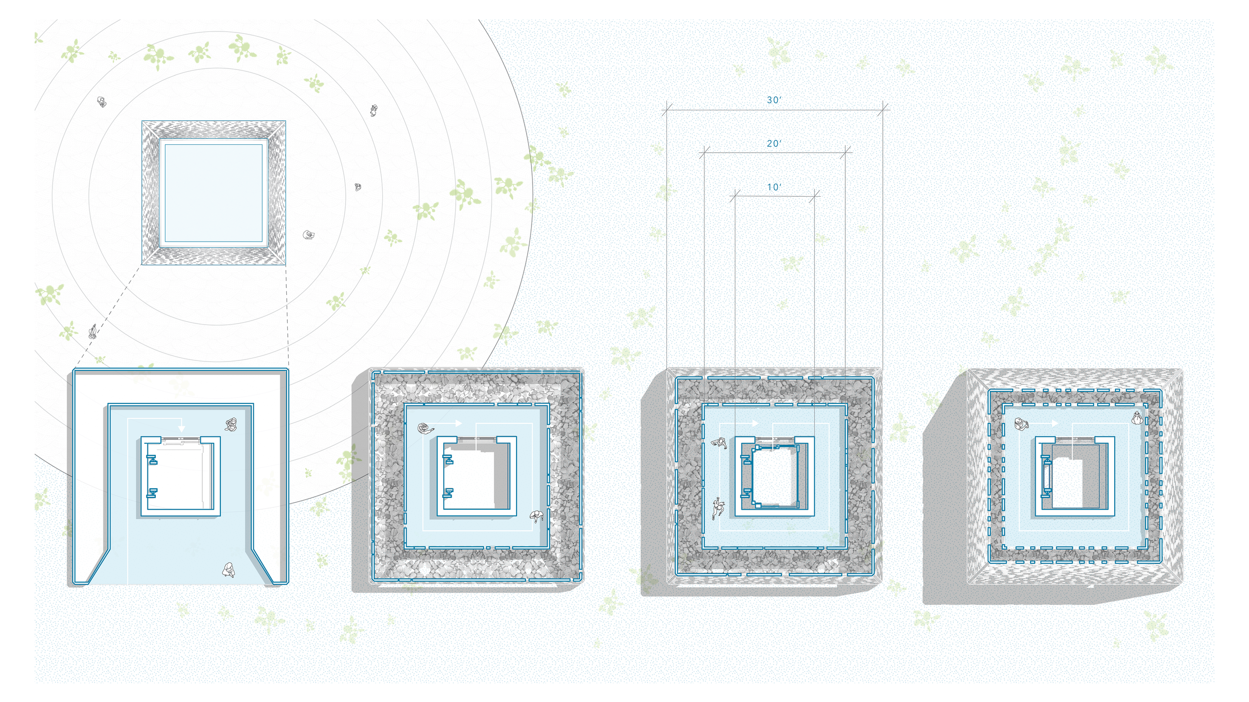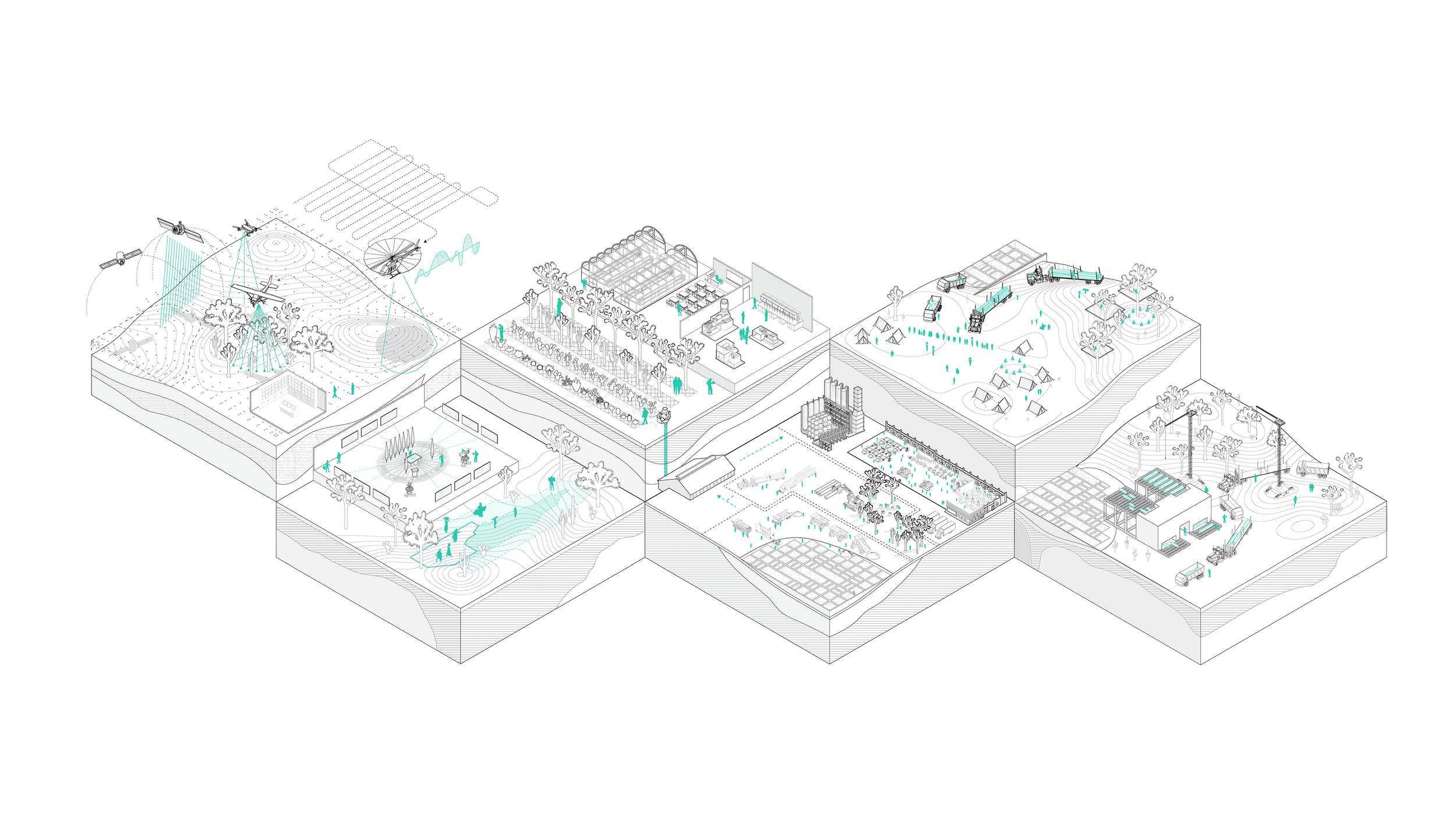 In pursuit of regenerative extraction practices, a 100-year model of cyclical growth and harvest sited in the Salton Sea stands to support the long-term well-being of the natural landscape while employing novel frameworks of extractive geographies. Each quadrant will regenerate for 75 years between 25-year harvest periods, and will be made of three zones: the Perimeter (timber forests), the Intermediary (phytomining), and the Interior (lithium brine). When used in conjunction with existing extractive methods, phytomining - the production of a ‘crop’ of metal by growing high biomass plants that accumulate high metal concentrations - can build long-term resource reserves and facilitate extraction through cleaner natural processes. Part of a dynamic, concentric system of lithium brine pools, phytomining farms, and timber plots, a hybridized extraction landscape offers greater resource abundance and ecological stability. Raw lithium can still be harvested through brine refinement, and conventional logging will continue - but under a sustainable and regenerative management model that scales back these traditional extractive methods.